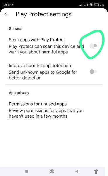 - Perhatikan pada halaman Play Protect Setting ada 2 (dua) pilihan On/Off, silahkan geser ke mode OFF untuk pilihan bagian atas ( lihat lingkaran hijau pada gambar diatas).